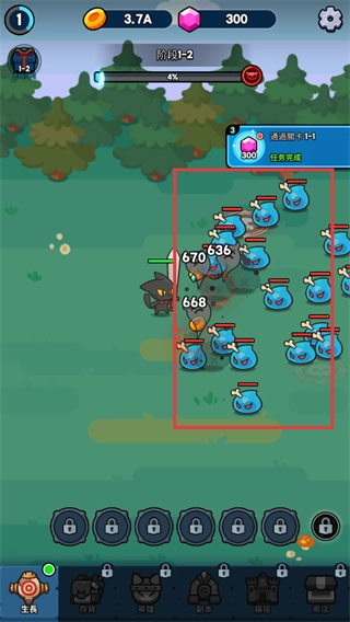 1、战斗时优先攻击蓝色小怪,完成【关卡1-1】任务能得到【钻石】300,帮助后续进行成长强化。