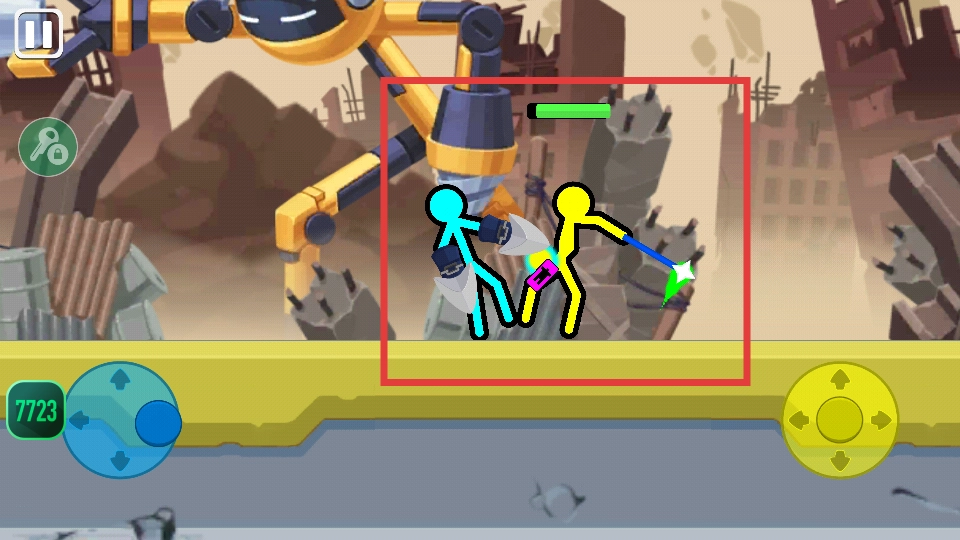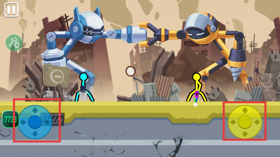 进入战斗场景后,可通过点击左侧红框里的蓝色方向按钮,以及右侧红框中的黄色方向按钮,来操控火柴人进行移动。