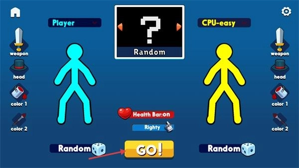 1、在角色选择界面点击【GO!】按钮,即可进入对战关卡,开启火柴人1V1决斗玩法。