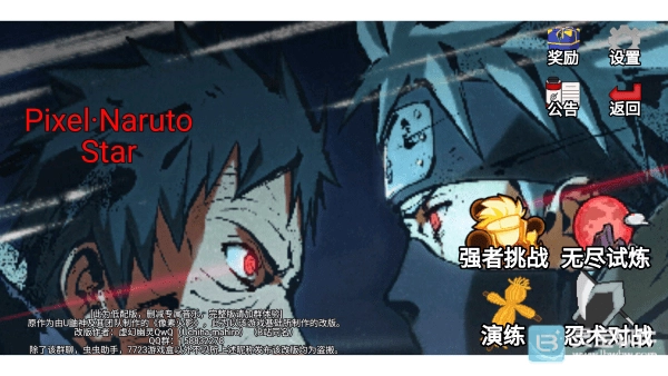 当你进入游戏开始界面时,会看到多种模式可供选择,包括强者挑战、无尽试炼、演练以及忍术对战等。