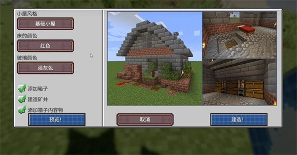 2、游戏开局时,我们可以利用初始物资里的小屋直接搭建庇护所,这里有多种不同类型的小屋可供挑选;选定类型后点击建造,还能借助预览功能来确定合适的建造位置。