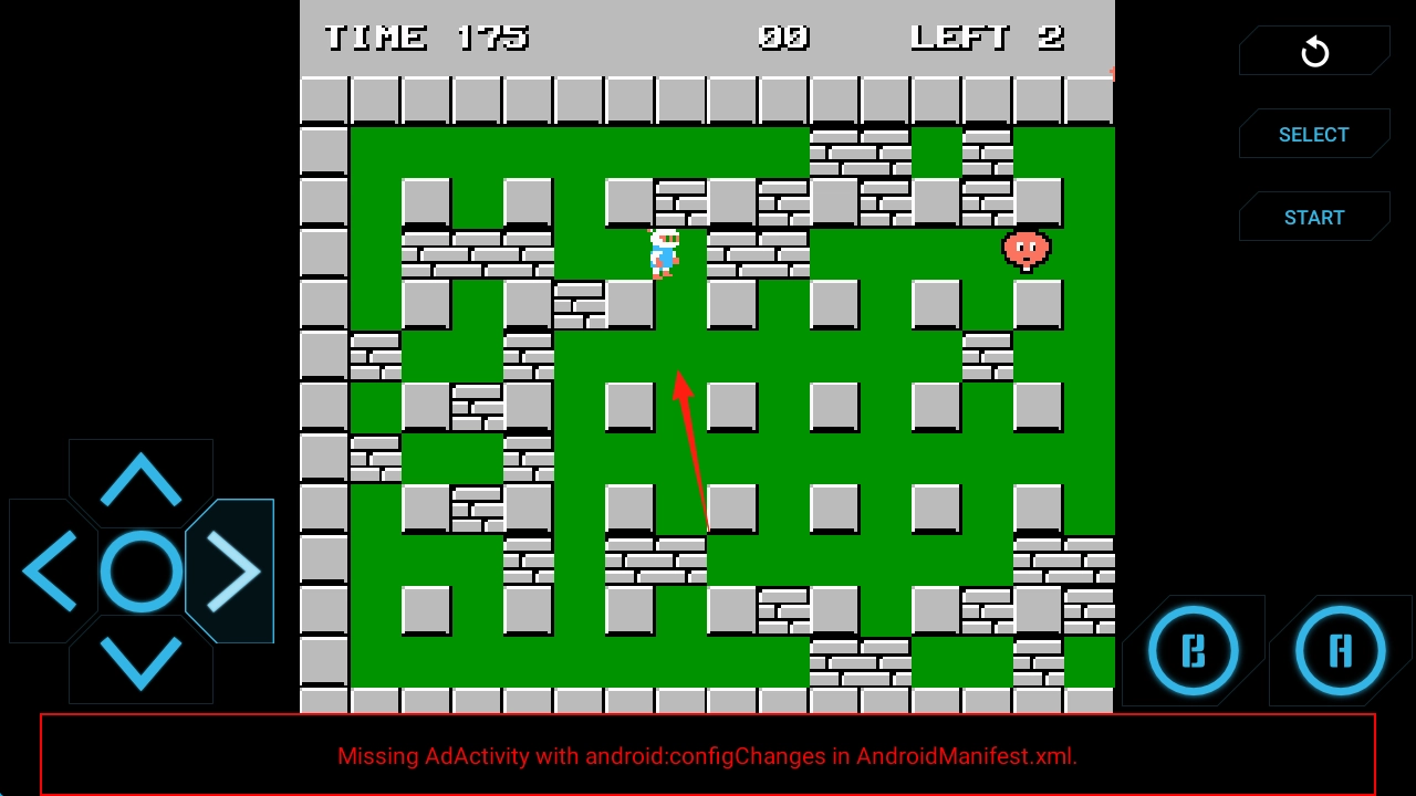 2、进入迷宫(红箭头指示),遭遇敌人(红圆脸形象)时,提前预判其移动路径,按下B键放置炸弹,借助爆炸效果清除怪物,同时炸开阻挡前进的障碍。