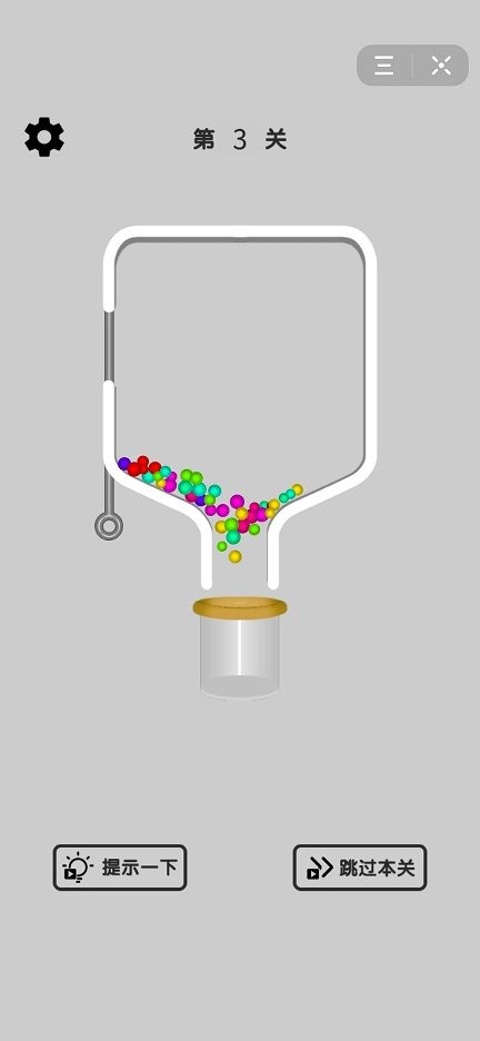 2、通过抽取钥匙放手让大量球球顺利掉落桶中,即可完成通关。