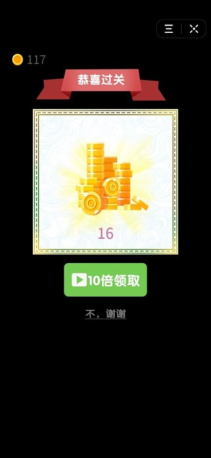 3、关卡挑战结束后,你可以通过观看广告来获取10倍的金币奖励哦。