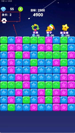 3、拯救萌星模式采用小关卡设计,设置多种变量与任务要求,每次消除后星星会上升一格,以此避免堆叠至顶端导致失败。