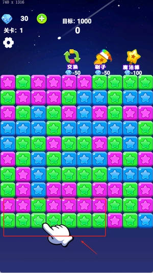 2、游戏操作采用点击拖动的方式,只要连接两个及以上颜色相同的星星即可完成消除;界面下方会清晰显示剩余步数和当前得分,能让玩家随时了解游戏进度。