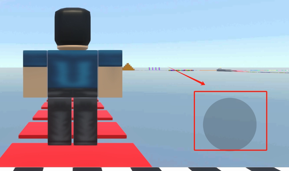 2、观察方块小人站在红色平台上,向右滑动屏幕来操控它朝着远处的彩色物件跳跃。