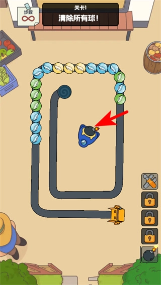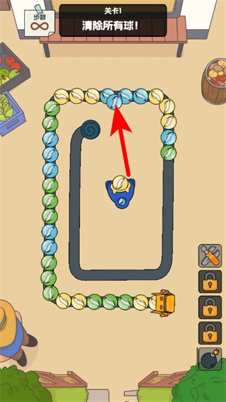 1、进入关卡1界面后,点击红色箭头所指的对应球区域,通过射击消除同色球,这是推进关卡的关键操作。