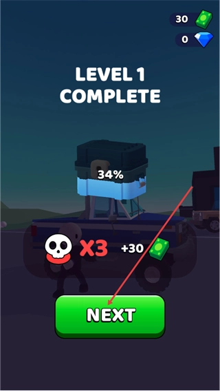 4、完成关卡1后,屏幕会显示LEVEL1COMPLETE界面,玩家可领取相应的货币奖励,点击NEXT按钮即可进入下一关,继续进行公路射击类的关卡挑战。