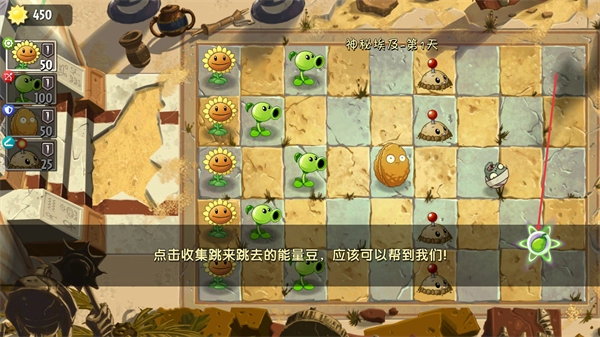 4、击败绿色僵尸后会掉落能量豆,需要点击收集那些跳动的能量豆,它可以在对战过程中提供助力,帮助我们更好地抵御僵尸。