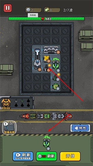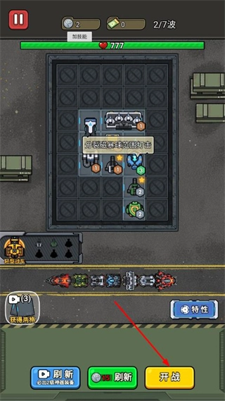 2、把合成好的高阶战车安排到阵地格子里,调整其位置以覆盖更大范围的防御区域,点击开战按钮即可触发丧尸波次的进攻。