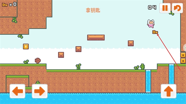 4、当前关卡的提示是获取钥匙,需要先通过方向按钮操控角色移动到钥匙周边,接着点击向上箭头进行跳跃,拿到这把钥匙来推动关卡进度。