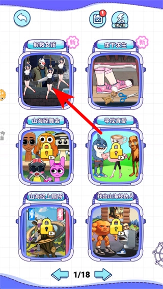 2、在关卡选择界面,点击红色箭头所指的解救女孩关卡,进入相应的解谜救援场景,开启该关卡的挑战。
