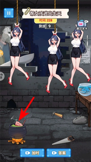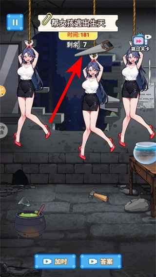 4、按照红色箭头的指示行动,运用已收集的锯子等道具,对困住女孩的绳索实施操作,助力女孩挣脱束缚、达成目标。