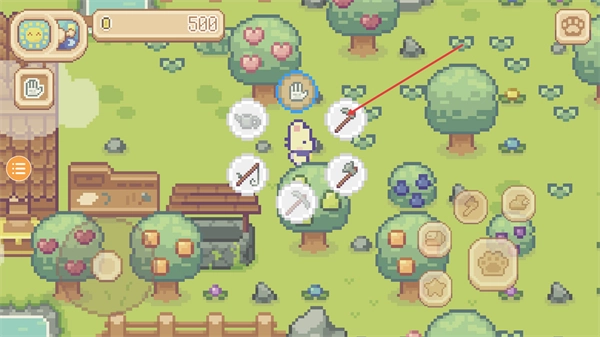 4、操控小萌猫使用锄头开垦一片田地来种植作物,能够在房屋周边找寻空地开展开垦工作。