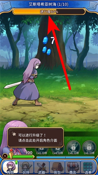 4、找到顶部的进度条,点击对应的区域来启动角色界面的升级流程。