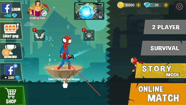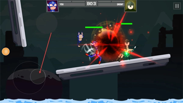 游戏采用侧面视角,两名火柴人角色对峙战斗,玩家通过虚拟按钮与手势操作实现攻击、防守和闪避动作。每个火柴人都具备专属技能树,包含快速攻击、强力打击、跳跃技巧等不同分支,需要玩家灵活搭配运用。此外,游戏内还提供拳套、棍子、炸药等丰富多样的武器与工具,可进一步丰富战斗策略,提升游戏的趣味性。