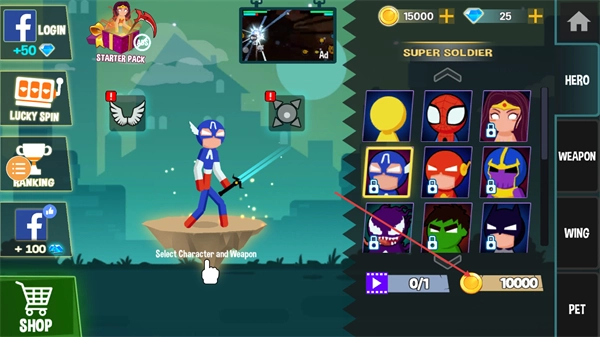 进入角色选择界面后,在SUPERSOLDIER分类下挑选可用角色,部分角色需消耗10000金币解锁,选定后就能进入战斗环节。