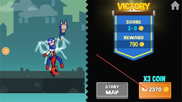 4、战斗获胜后会展示VICTORY界面,在该界面中可以查看SCORE2-0的战绩以及REWARD790的奖励,同时也能够选择获取三倍金币后返回主界面。