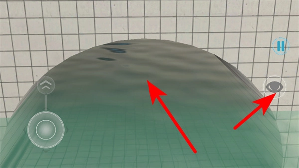3、碰到水域场景时,按照红色箭头的提示,控制角色在水面移动或者游泳,与此同时借助右侧的按钮来调整视角。