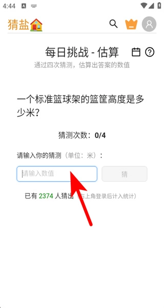 在每日挑战的“估算”环节里,点击输入框后填入你推测的标准篮球架篮筐高度数值,接着点击“猜提交”按钮,整个过程共有4次猜测机会。