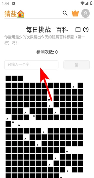 2、在每日挑战的百科板块中,当你在输入框里输入一个字并点击“猜”按钮后,就能开启挑战——通过多次尝试,以最少的次数猜出被隐藏的百科标题内容。