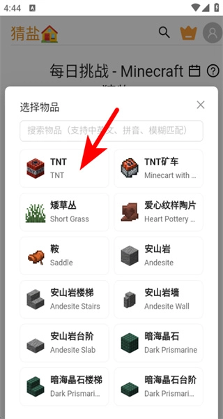 3、每日挑战-Minecraft选物品时,在列表里找到TNT选项并点击,就能选择该物品参与对应的挑战环节。