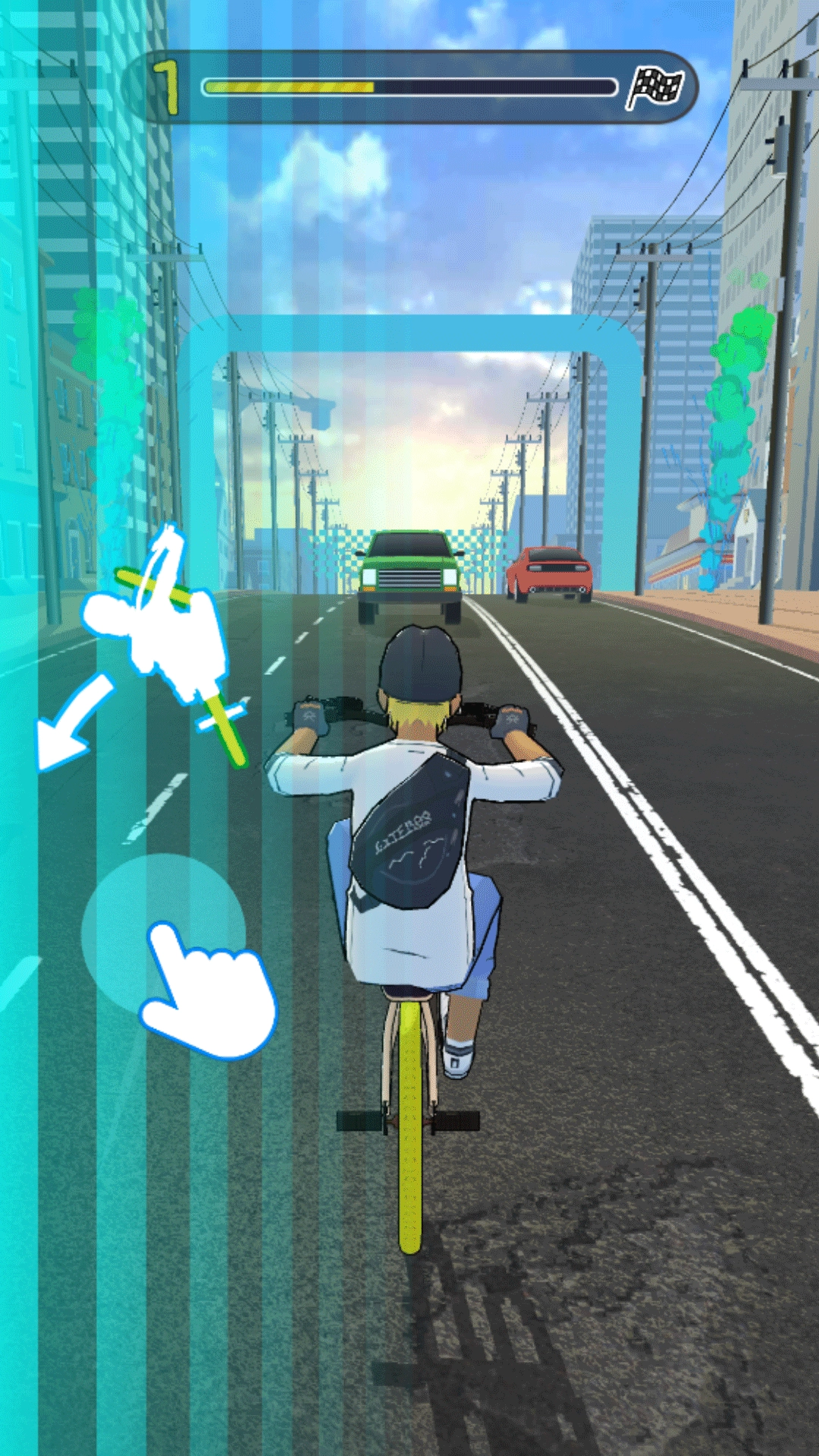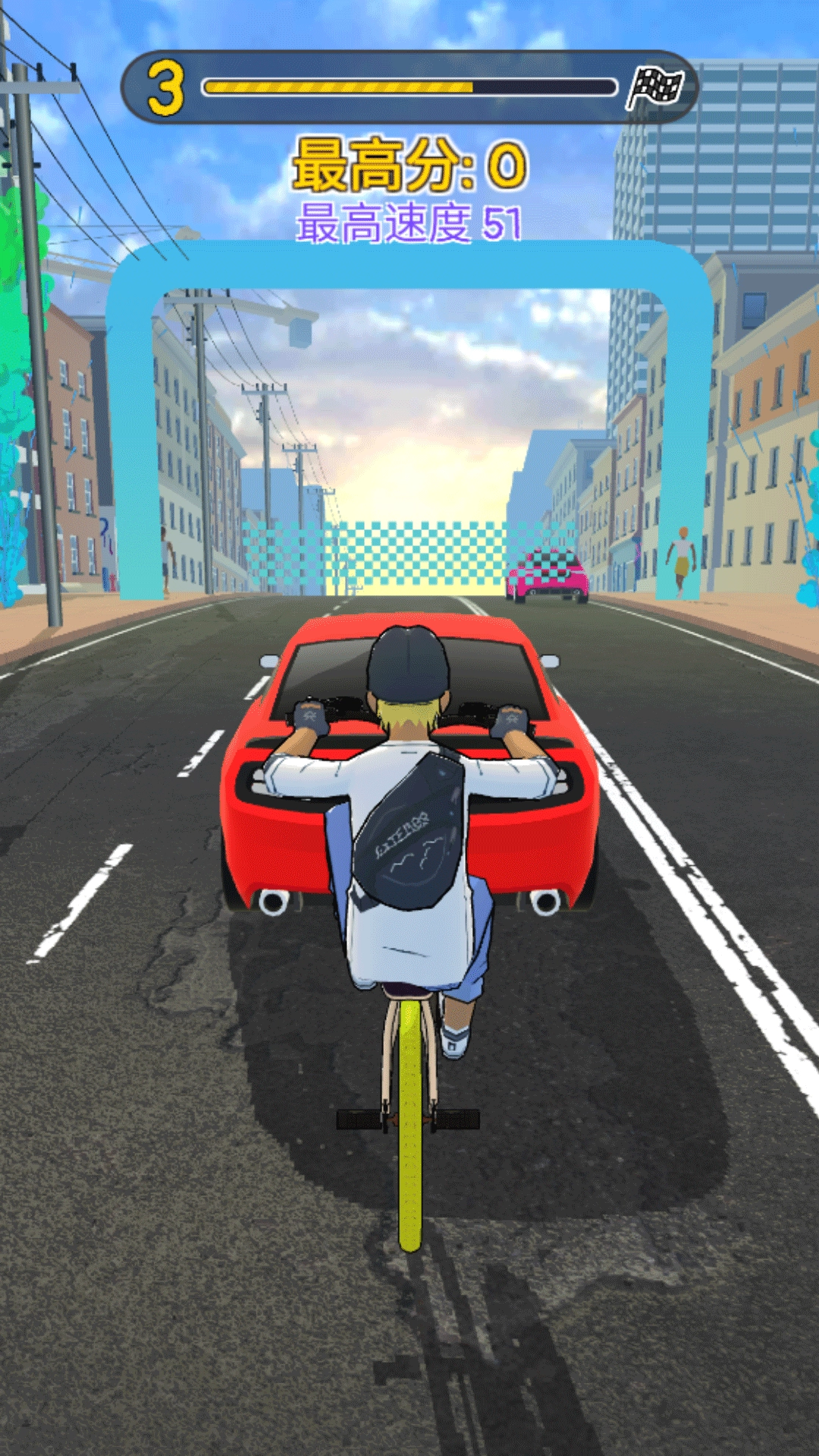 3、玩家操控角色在道路上骑行,过程中需躲避汽车、交通锥等障碍物,每成功躲避一次即可获得对应的分数。