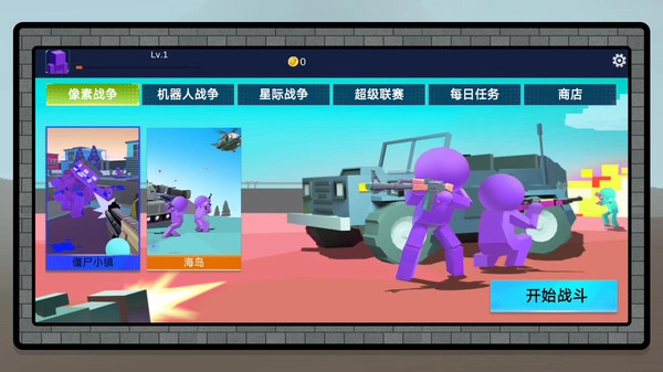 1、选择像素战争、机器人战争等游戏模式,可组队参与或单人挑战,达成占领区域、歼灭对手等任务目标。