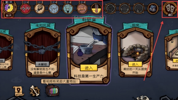 1、在游戏界面中,我们先查看上方的生存属性,确认状态良好后,点击【出门】按钮,就能开启荒野探索之旅啦。