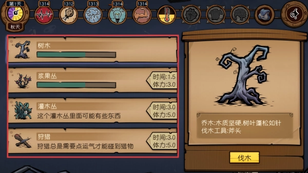 2、选择出门后,在采集界面选择【树木】、【浆果丛】等选项,消耗体力来采集资源,为生存积攒物资,别忘了留意时间和体力的消耗情况哟。