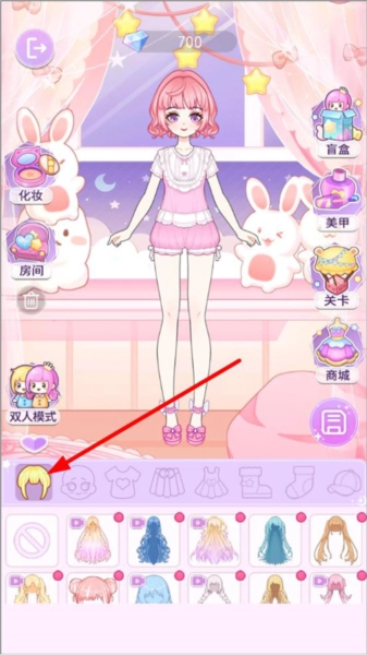 2、进入装扮房间后,玩家能够为人物进行化妆、美甲,还可以开启双人模式等操作,点击下方的工具栏即可选择人物的发型;