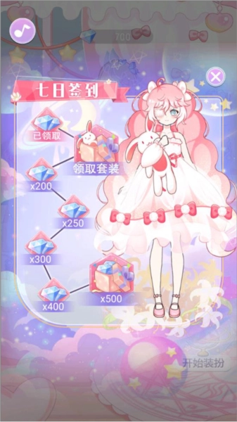 1、启动《装扮魔法少女》并进入主场景后,玩家能够查看房间布局、参与各类活动、浏览商城以及挑战关卡等,点击签到按钮还可领取钻石奖励。
