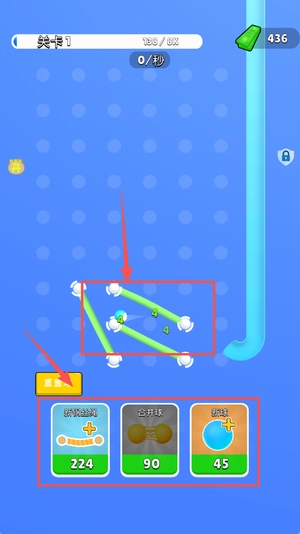 2、点击屏幕使管道发射小球,调整好角度,让小球碰到绳索、风扇等道具,借助这些道具改变方向,完成弹射过程。