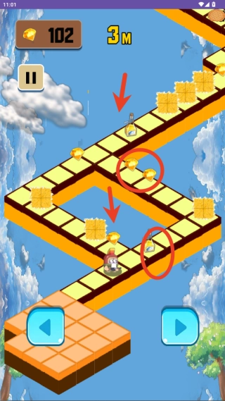 2、利用游戏界面左右两侧的方向按钮,操控小人持续向前移动。请务必保证你迈出的每一步都踩在实地上。