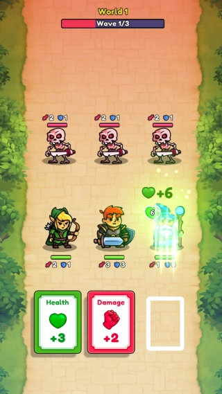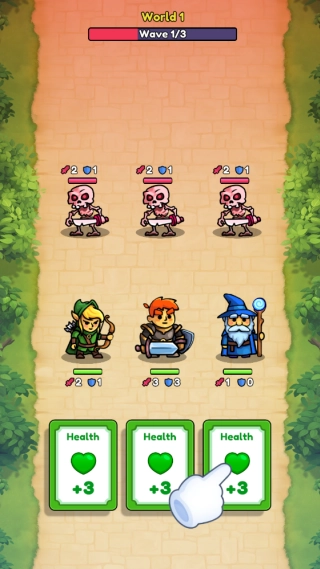 战斗卡片是一款结合卡牌玩法的策略闯关游戏。玩家将率领由弓箭手、战士和法师构成的冒险小队挑战关卡,每次发起攻击前可获得三张卡牌,这些卡牌具备回复生命值、增强防御力、提升攻击力等三类作用,玩家需对卡牌进行合理分配,为英雄们配备合适的卡牌,方能顺利战胜关卡中的怪物,完成闯关。