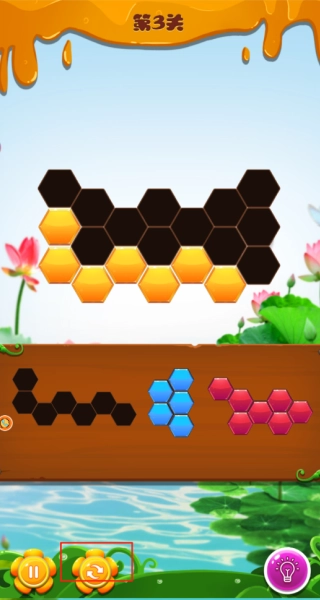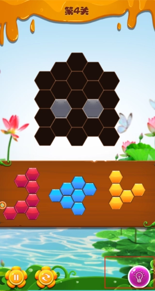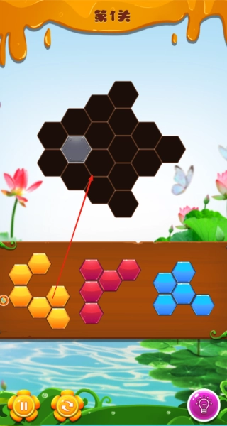 1、安装好游戏后,从第一关开始,只需把下方的六角方块拖到上方的空格中就行。