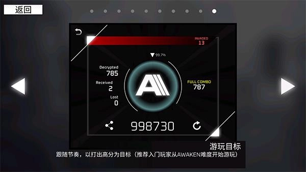 跟随节奏,以获取高分为目标(建议入门玩家从AWAKEN难度开启游玩)。