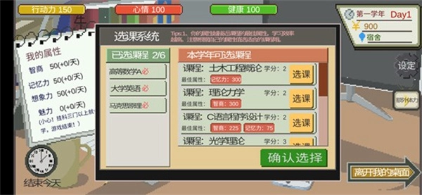 1、进入游戏后,映入眼帘的是宿舍里自己的那张桌子。左边能看到个人属性的显示,桌上还摆放着“我的电脑”“安排学习”“我的手机”这些物品。