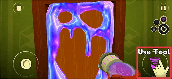 2、安装好电池后,把角色移动到门口位置,接着点击“Use Tool”来吸取粘液,等粘液全部吸取完毕,再点击门把手就能出门了。
