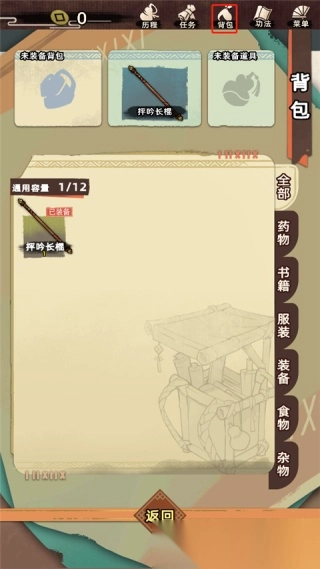 8.接着就能点击左上角的背包,查看里面的装备、服装、药物、食物等物品。