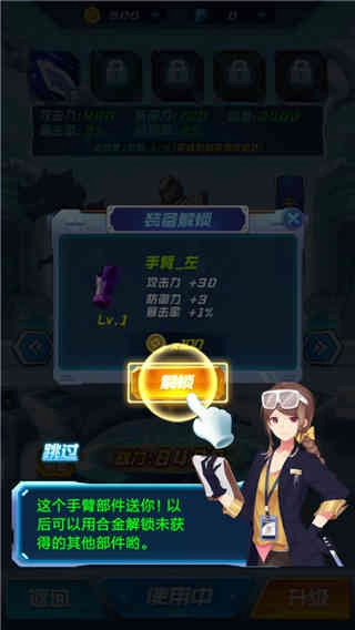 2、按照指示进入机甲仓库,挑选装备后点击解锁,就能启用该装备。