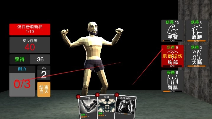 2、游戏采用卡牌玩法,玩家需要挑选合适的卡牌开展肌肉锻炼,每张卡牌对应的训练效果与奖励各不相同。