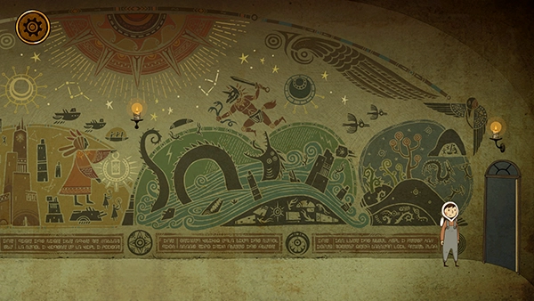主角可以通过大厅里小船左下方的黄色按钮来切换墙上大壁画的图案,当对应图案出现后,点击右侧的绿色按钮,就能切换壁画顶部的小图标,让它和神像上的图标保持一致,这样就能点亮墙上圆形小壁画旁的神像(无需特意切换视角确认图标样式,一次没点亮的话连续多按几次即可),最终彻底激活神像。