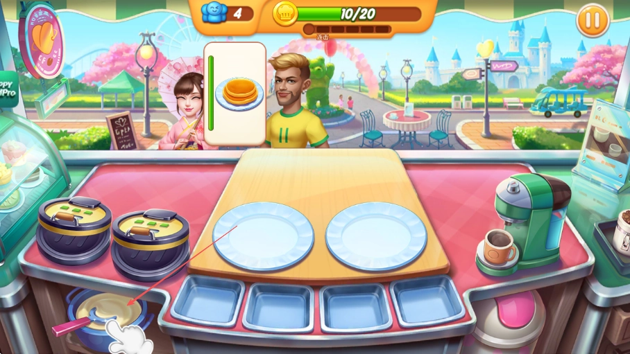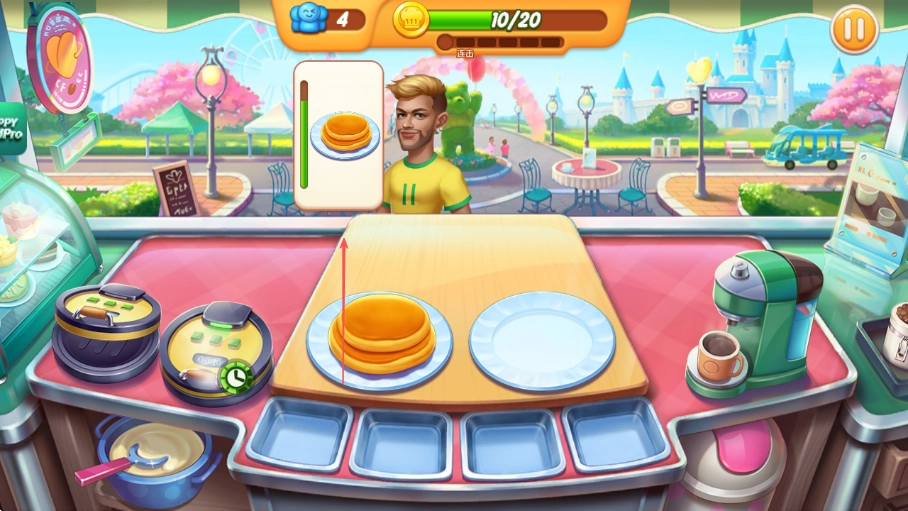 4、当顾客点饮品时,操作咖啡机等设备制作饮品,快速上菜获取金币以通关。