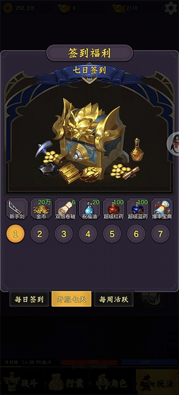 1、进入游戏后,点击右下角的“玩法”按钮,依次选择“福利”“签到”,在开服七天的活动中领取新手武器;接着打开背包,将其中一把武器拖动到另一把武器上进行合成,这把合成后的武器实用性较强,可适当增加3-4点幸运值。离线挂机功能在“玩法”菜单下的“托管”选项中。技能会随着等级提升由系统自动赠送。点击右上角的广告入口可获取额外福利。