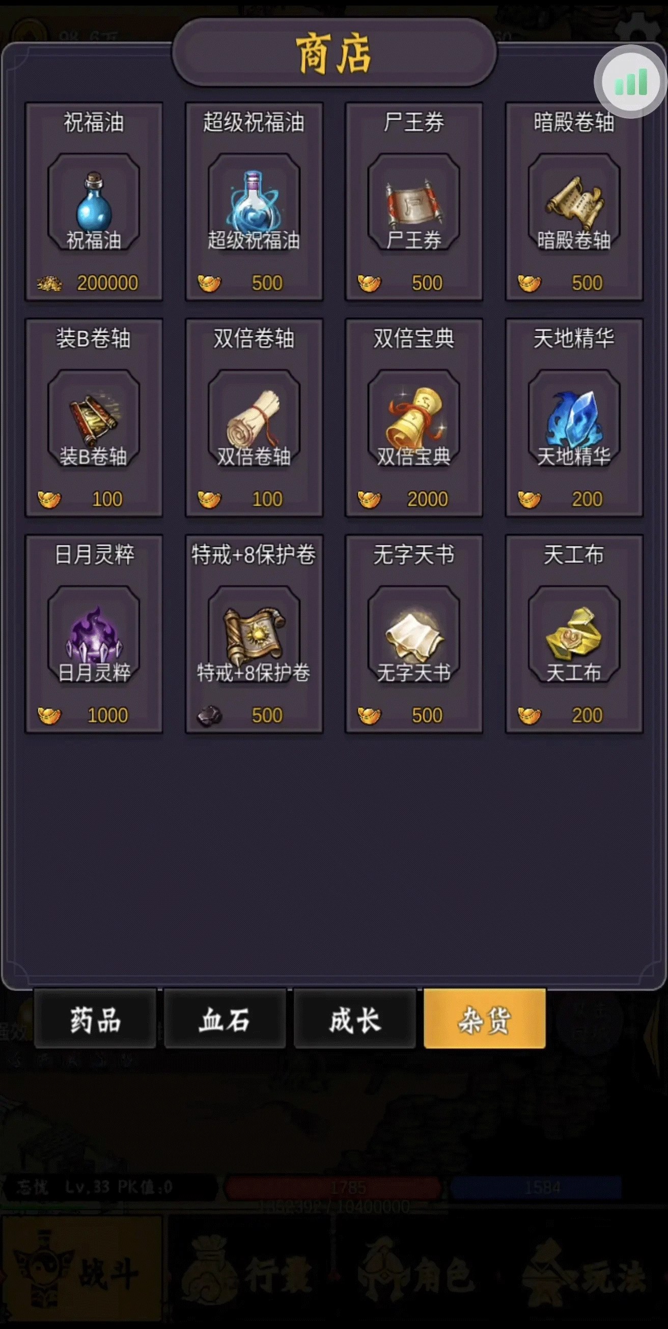 8、前期元宝别乱花,直接去主城商店买超级祝福油把武器幸运加到九;前期金币全部用来提升家园等级,后续家园升级需要元宝,早开家园能通过后续时间积累重要道具。灵魂结晶可用于开启命运之门,前期别用在魂骨上。奇珍只有金色boss掉落。前期送的星命丹、坐骑丹先留着,等解锁炼丹功能后,5个星命丹或坐骑丹能合成4~5个妖丹;5个属性相同的元素道具可合成一次加5点属性的丹。装B卷这版本作用很小,若不打算升到20级装b以上,不建议购买。