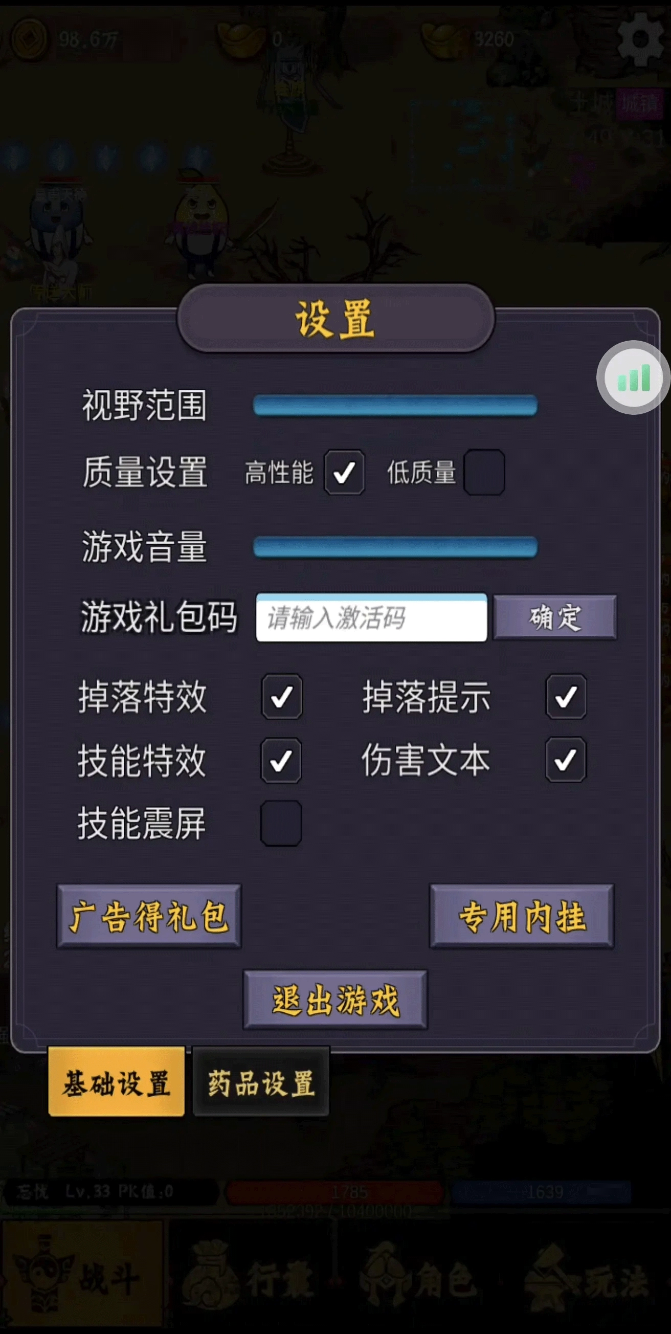 1、先去处理杀鸡的事,不过记得在动手前把礼包码领了——通用礼包码有tap123、sgcq和fuli20,在右上角的设置里点开输入就能领取。之后别忘了开启双倍经验,再把武器幸运点调一下。
