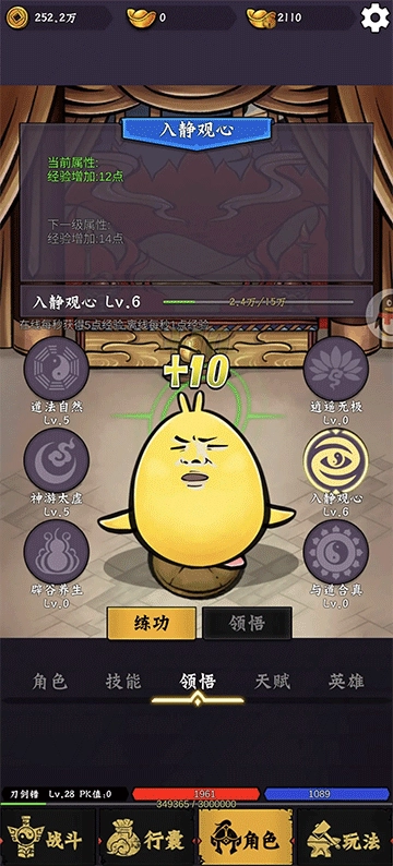 2、进入角色界面后,点击“领悟”选项,选择“入静观心”这一技能。该技能能为每只被击败的怪物增加额外经验,在游戏前期作用显著,到了后期则可以考虑修炼其他技能。