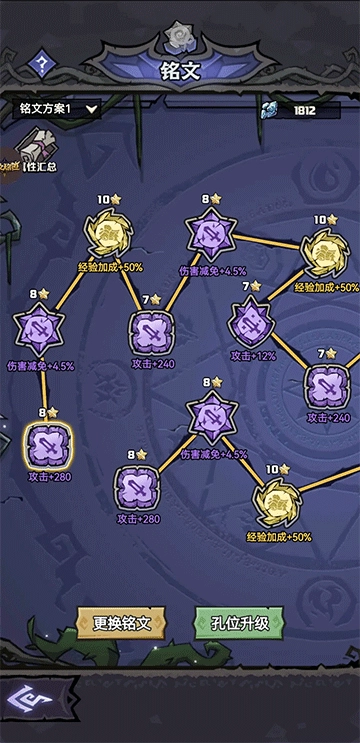 3、解锁铭文功能后,铭文选择上可以搭配攻击、攻击百分比、减伤(可根据自身需求调整)以及经验加成,其中经验加成务必优先升级。注意事项:最下方的铭文槽需要消耗钻石解锁,若有冲榜计划的玩家,建议优先解锁这一排铭文槽。